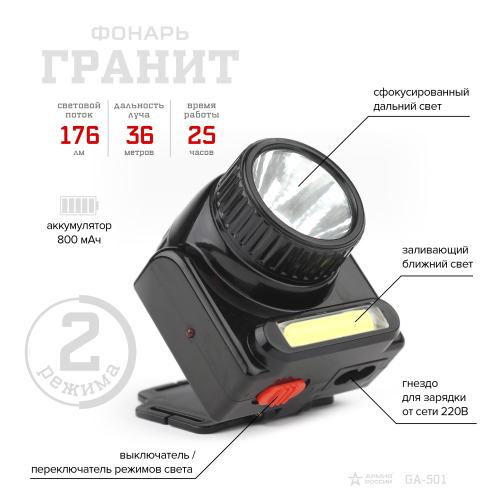 ЭРА Армия России Гранит - мощный налобный светодиодный фонарь в подарочной коробке. Два режима - ближний свет на мультикристальных светодиодах СОВ и дальний свет на классических LED. В комплекте - удобный шнур для зарядки аккумулятора от электросети и мягкий регулируемый ремешок с фирменной звездой "Армия России".Этот фонарь - часть серии ЭРА Армия России, которая является совместным проектом отечественного бренда ЭРА и АО "Военторг", действующего на основании лицензии Министерства обороны РФ. Мощный аккумулятор (800 мАч) непрерывно работает без подзарядки 25 часов. Режимы переключаются акцентированной красной кнопкой. Пользователь может выбрать либо дальний направленный свет (длина луча - 36 метров!), либо ближнее заливающее освещение, особая яркость которого достигается использованием технологии СОВ ("мультикристалл на плате") - промышленный свет, адаптированный для универсальных целей. Название фонаря - отражение одного из известнейших достижений российской военной техники. Гранит - это сверхзвуковая противокорабельная крылатая ракета с повышенной дальностью действия.