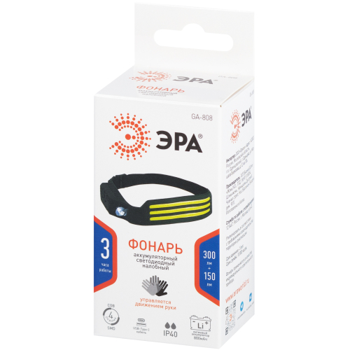GA-808 Налобные ЭРА Фонарь налобный светодиодный ЭРА GA-808 Кибер-3 аккумуляторный, 5 Вт COB + 3 Вт LED, сенс.управл., 5 режимов