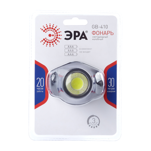 ЭРА GB-410 функциональный и эргономичный налобный LED-фонарь с 3 режимами: максимальная яркость, 50% яркости, аварийное мигание. Угол наклона фонаря регулируется для удобного выбора направления света. Работает налобник от 3 мизинчиковых батареек (3 х ААА), одного комплекта которых хватает на 20 часов непрерывного свечения. Ровный яркий свет создают современные светодиоды, которые не искажают естественные цвета предметов и не тускнеют со временем. Дальность светового луча 30 метров. Этот стильный налобный фонарь от ЭРА станет надёжным помощником в походах, при выполнении строительных, ремонтных и бытовых работ.