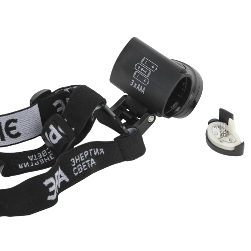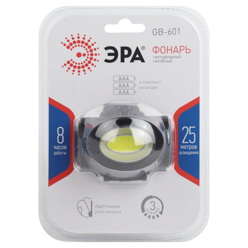 ЭРА GB-601 - светодиодный налобный фонарь с тремя режимами работы и адаптивным углом наклона. Работает от 3 мизинчиковых батареек (3 х ААА), одного комплекта элементов питания хватает на 8 часов непрерывного использования.