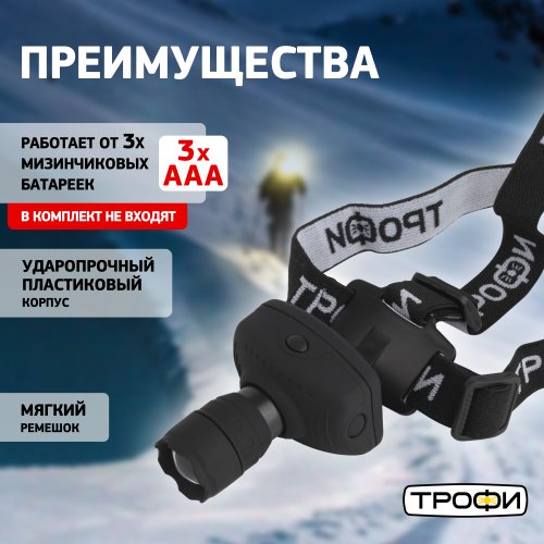 Фонарь налобный светодиодный Трофи Налобные GB-301 на батарейках мощный яркий 2 режима черный с регулируемым фокусом