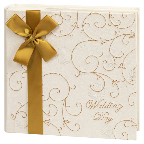 Обложка из плотного картона с обложкой из PVC с вышивкой и лентой в качестве декора. Внутри содержится блок из 50 белых листов. Альбом рассчитан на 200 фотографий форматом 15 см х 10 см. Для фотографий предусмотрено поле для записей. На каждой странице с фиксатором-окошком из полипропилена можно разместить по 2 фотографии. Переплет книжный.