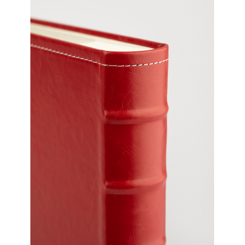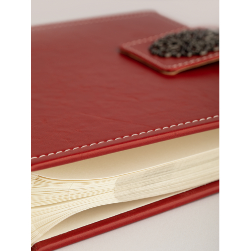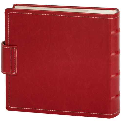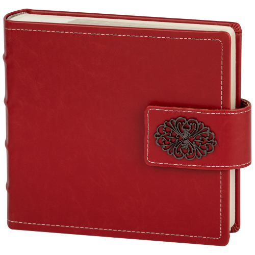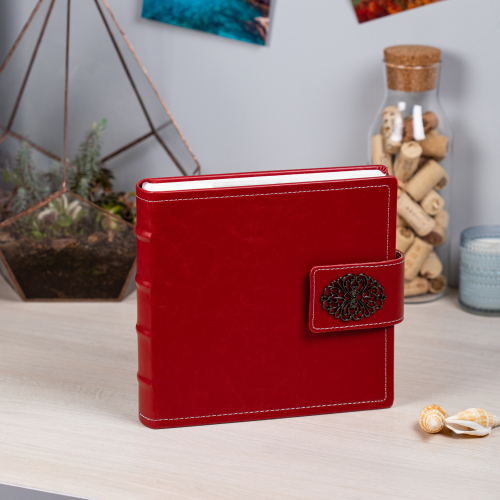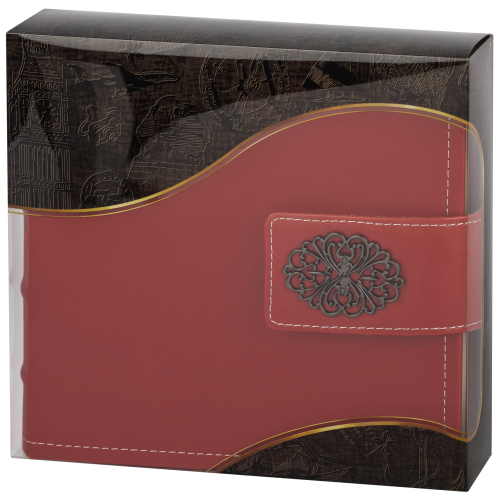 Обложка из плотного картона под кожу с застежкой. Внутри содержится блок из 50 белых листов. Альбом рассчитан на 200 фотографий форматом 15 см х 10 см. Для фотографий предусмотрено поле для записей. На каждой странице с фиксатором-окошком из полипропилена можно разместить по 2 фотографии. Переплет книжный.
