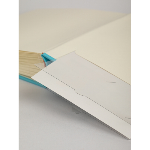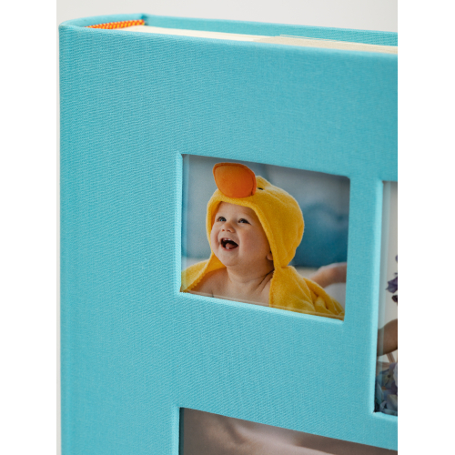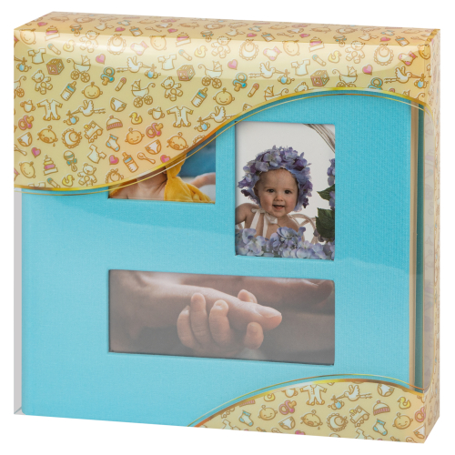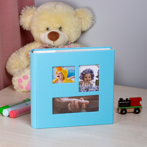 Обложка из плотного картона из PU с окошками. Внутри содержится блок из 50 белых листов. Альбом рассчитан на 200 фотографий форматом 15 см х 10 см. Для фотографий предусмотрено поле для записей. На каждой странице с фиксатором-окошком из полипропилена можно разместить по 2 фотографии. Переплет книжный.
