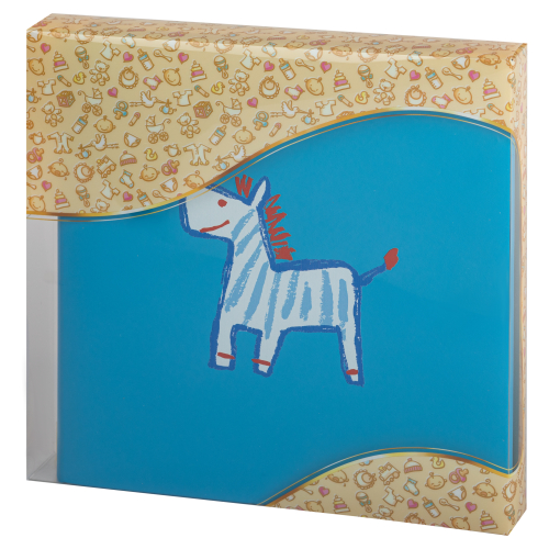 Обложка из плотного картона с цветным принтом и рамкой под фото. Внутри содержится блок из 50 белых листов. Альбом рассчитан на 200 фотографий форматом 15 см х 10 см. Для фотографий предусмотрено поле для записей. На каждой странице с фиксатором-окошком из полипропилена можно разместить по 2 фотографии. Переплет книжный.