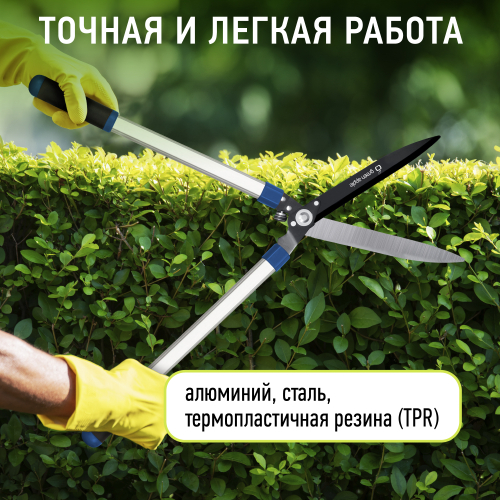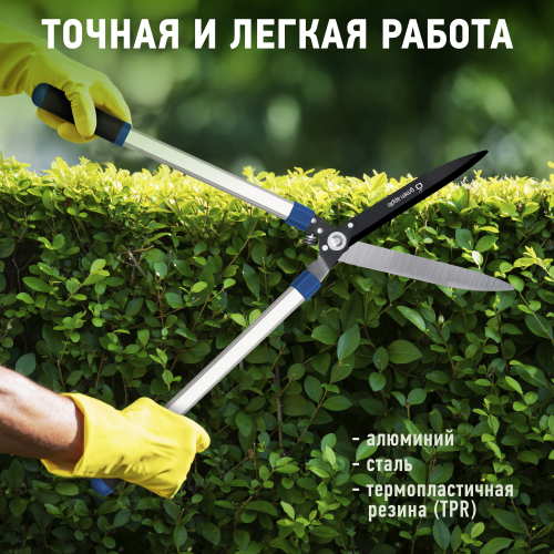 Для обрезки веток деревьев и кустов подойдет кусторез GREEN APPLE GAECO03-12 серии Дача с длиной основного ножа 300 мм. Прямые лезвия выполнены из прочной, острозаточенной стали. Рукоятки инструмента сделаны из алюминия.