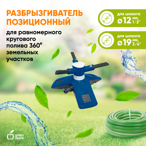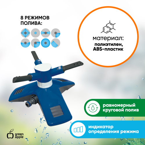 Разбрызгиватель Green Apple GANS-03 с круговым принципом орошения обеспечивает равномерный и эффективный полив садово-огородных участков. Вращение распылительной насадки по кругу позволяет осуществлять полив в радиусе 360 градусов на участке площадью до 100 м². Данная модель предусматривает 8 режимов, настраиваемых в зависимости от потребностей. Green Apple GANS-03 оснащен быстросъемным соединительным коннектором с уплотнительными вставками и устойчивым основанием. Пластиковый корпус изделия устойчив к повреждениям и неблагоприятным воздействиям.