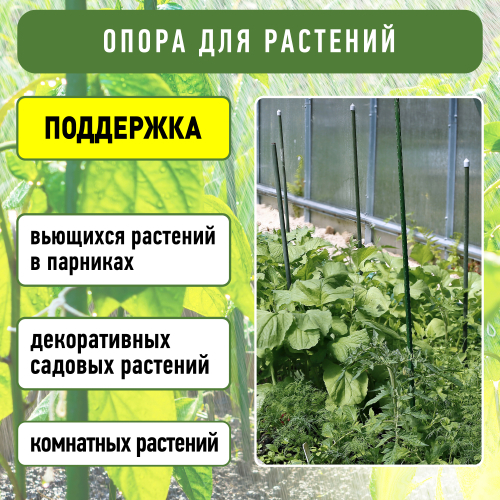 Опора для растений - это садовый аксессуар, предназначенный для поддержки тонкого стебля или ствола растения в вертикальном положении. Поддержка изготовлена из металла, покрытого пластиком - эти материалы не наносят вред здоровью рассады, безопасны для окружающей среды. Широко используются для поддержки декоративных садовых и комнатных растений. Также применяется для поддержки вьющихся растений в парниках. Держатель втыкаемый фиксируется в почве в горшке или на участке. Дополнит композицию и обеспечит бережный уход. Цвет: зеленый. Высота 90 см, диаметр 8 мм.
