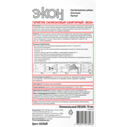 Санитарный Силиконовый герметик на основе высококачественного силиконового полимера. Содержит фунгициды – асептические вещества, препятствующие росту плесени и применяется в помещениях с повышенной влажностью: ванных комнатах, душевых кабинах, туалетных комнатах, кухнях. Применим при общих строительных и ремонтных работах как внутри, так и снаружи помещения. Обладает хорошей адгезией к эмали, стеклу, керамике, дереву, металлам, эмалированным покрытиям.
