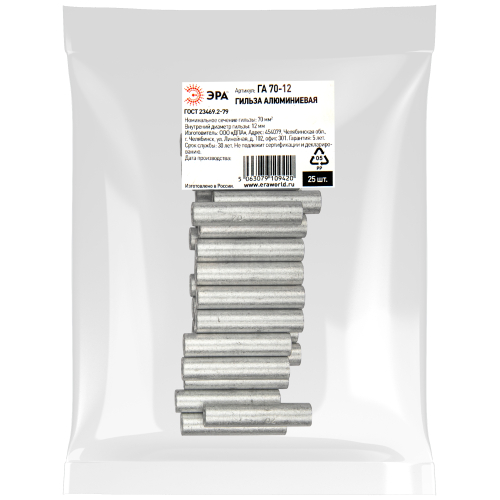 Гильза алюминиевая ЭРА ГА 70-12 используется для соединения алюминиевых жил проводов и кабелей с сечением до 70 мм² и применяется для кабелей напряжением до 35 кВ.