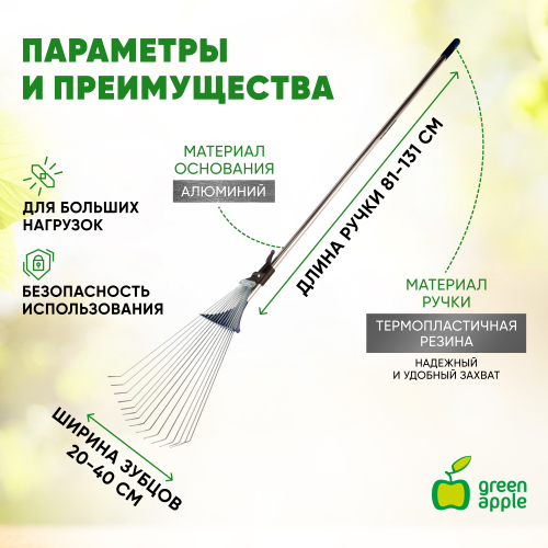 Веерные грабли легки и удобны в использовании. С помощью специального механизма размер грабель легко изменяется. Гибкие оцинкованные пружинящие стальные зубья идеально подходят для сгребания листьев, скошенной травы, и прочего садового мусора. Прочная, но легкая конструкция для комфортной работы в саду. Устойчивы к механическим воздействиям - благодаря этому применять грабли можно и на неровных поверхностях. Аксессуары от компании Green Apple - это воплощение надежности, износостойкости и удобства.