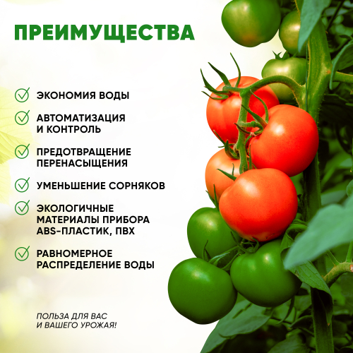 Постепенный и равномерный капельный полив предотвращает эрозию и переувлажнение почвы и способствует здоровому и быстрому росту растений!