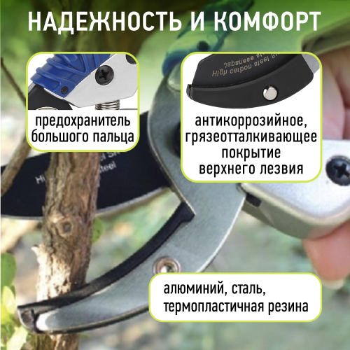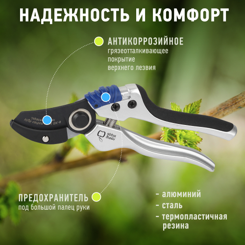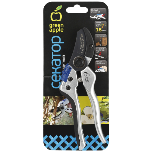 Контактный секатор GREEN APPLE GTAS72-005 с пружинным механизмом предназначен для срезания устаревших сухих веток толщиной до 18 мм. Высокая эффективность реза обеспечивается благодаря двум регулируемым лезвиям, изготовленным из прочной и долговечной стали. Антикоррозийное, грязеотталкивающее покрытие верхнего лезвия обеспечивает защиту инструмента от погодных условий. Литая конструкция с алюминиевым корпусом обеспечивает стойкость к неблагоприятным воздействиям и повреждениям.