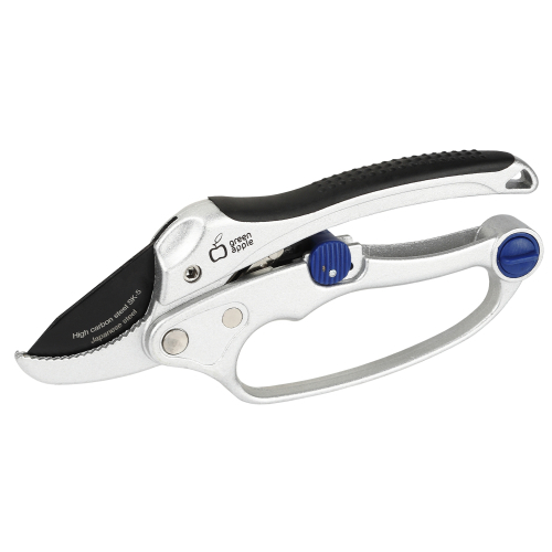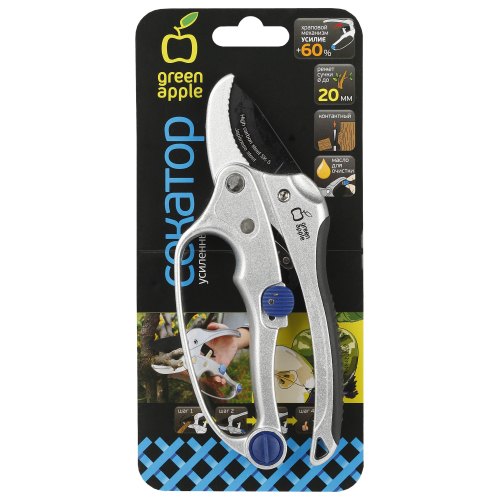 Усиленный секатор GREEN APPLE с храповым механизмом предназначен для обрезки без дополнительных усилий толстых веток и лозы. Храповой механизм позволяет за несколько приемов справиться даже с самыми толстыми ветками.
