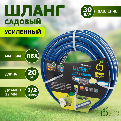 Шланг поливочный Green Apple GWGH1-030 имеет длину 20 метров и поставляется в виде бухты. Для подключения насосного оборудования, а также различных приспособлений для полива используется выходное отверстие с диаметром 1/2" (12 мм).