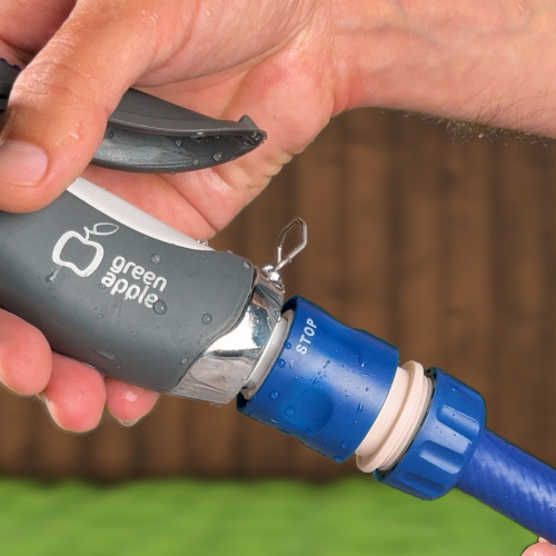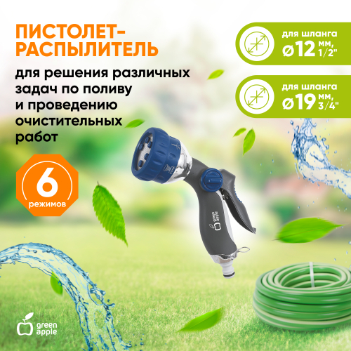 Пистолет-распылитель "Green Apple" предназначен, в зависимости от режима, для решения различных задач по поливу и проведению очистительных работ. Снабжен регулятором изменения интенсивности струи и фиксатором для длительного полива. Он имеет шесть режимов полива: вода может распыляться тонкой водяной пылью, а может подаваться концентрированной струей, с помощью которой можно помыть машину, смыть пыль и строительный мусор. Приятной особенностью распылителя является возможность использования его в качестве насадки для дачного душа. Установив его стационарно, Вы получите эффективную систему орошения для одного конкретного участка площади.