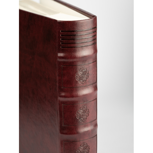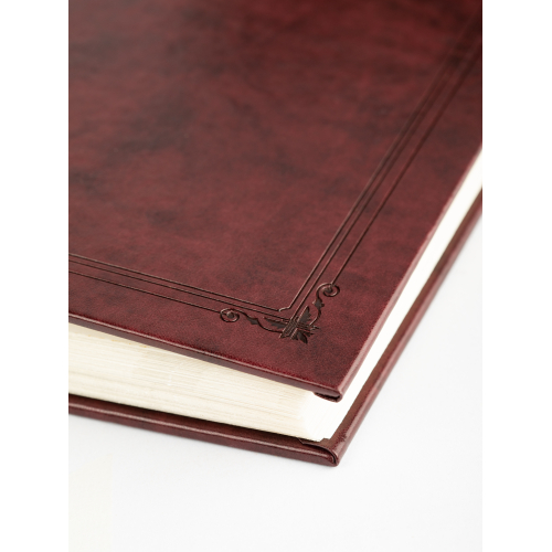 Обложка из плотного картона обтянута тканью под кожу с рисунком. Внутри содержится блок из 50 белых листов. Альбом рассчитан на 200 фотографий форматом 15 см х 10 см. Для фотографий предусмотрено поле для записей. На каждой странице с фиксатором-окошком из полипропилена можно разместить по 2 фотографии. Переплет книжный.