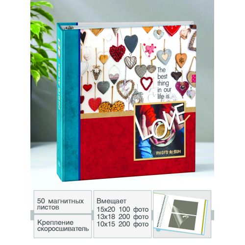 Фотоальбом с магнитными листами , размер листов 23*28 , крепление - скоросшиватель , обложка -картон , 50 магнитных листов, тематика - любовь ,сердца