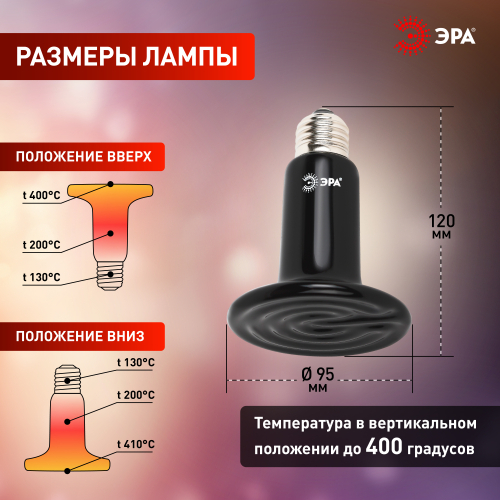 Инфракрасный керамический нагреватель FITO-200W-НQ от ЭРА с цоколем Е27 серии CeramiHeat - прекрасное решение для курятника или террариума. Лампа для птиц обладает отличным тепловым эффектом: температура в вертикальном положении может достигать 400 градусов. Керамическая лампочка не нарушает режим сна и бодрствования животных, так как не излучает свет. Мощность 200 Вт, имеет возможность диммирования. Эксплуатация лампы возможна только с керамическим патроном. Минимальное расстояние до пластиковых частей клетки - 15 см. Площадь обогрева курятника до 1 м2. Положение лампы от дна брудера - не менее 40 см. Лампа для цыплят также может использоваться во влажной среде. При работе лампы необходимо обезопасить от прикосновения к ней животных, для этого рекомендуется использовать светильники с сетчатыми рассеивателями и термостойкими проводами. Замена лампочки возможна только после её остывания. Лампа для рептилий и цыплят от компании ЭРА станет незаменимым атрибутом для Ваших животных!