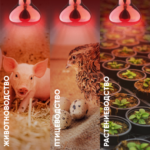 Инфракрасная зеркальная лампа с красной колбой. Активно используется в животноводстве, птицеводстве и растениеводстве. Максимальная тепловая мощность без яркого света. Идеальна для стабилизации теплового баланса новорождённых и молодых животных. 100 % энергии переходит в тепловую. Работа лампы не зависит от скачков сети, микроимпульсов. Не требуются стабилизаторы напряжения – лампа работает даже при пониженном напряжении. Мгновенно включается и нагревается. Минимум пульсаций освещения. Компактные размеры (удобно при транспортировки и использовании). Используется только с керамическими цоколями (не с пластиковыми!).