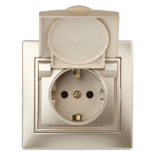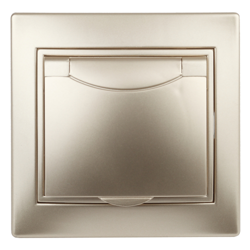 Розетка с крышкой со шторками серии Intro Plano скрытой установки цвет шампань 1-203-04. Номинальные характеристики 16А 250В. Розетка выполнена из керамики, укомплектована одноместной рамкой, оснащена винтовыми клеммами. Клеммы с двумя отверстиями позволяют соединять соседние розетки шлейфом. Установка в подрозетник производится как на монтажные лапки, так и на винты. Для установки 2-х и более устройств в несколько подрозетников в ряд дополнительно используются многоместные рамки: 2-х постовая - 1-502-хх, 3-х постовая 1-503-хх, 4-х постовая - 1-504-хх (где хх - цветовой код: 01 - белый, 02 - слоновая кость, 03 - алюминий, 04 - шампань, 05 - антрацит, 10 - венге, 11 - сосна).