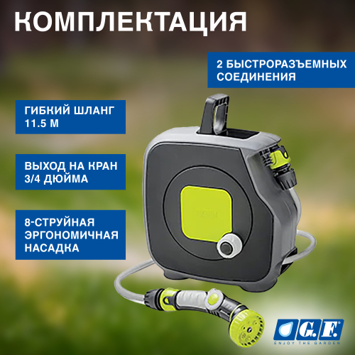 • 11,5 м гибким плетеным шлангом (10 м внутренний втягивающийся + 1,5 м внешний)
