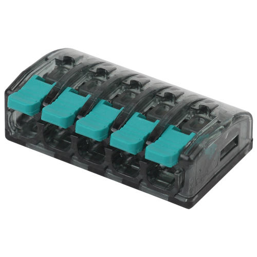 Клеммы СМК компактная с плоско-пружинным зажимом предназначены для многоразового присоединения и ответвления одножильных и многожильных проводников из меди в электрических цепях переменного тока с частотой 50 Гц напряжением до 400 В. Клемма имеет более компактные размеры в сравнении с привычными ручейковыми клеммами, прозрачный корпус позволяет контролировать контакт проводников с контактными пластинами. Корпус клемм изготовлен из самозатухающего пластика, монтаж не требует использования инструментов. Подходит для многоразового использования. При монтаже необходимо снять изоляцию с проводников в соответствии с обозначениями на корпусе клеммы. Поднимите рычажок, вставите проводник в гнездо, опустите рычажок в исходное положение.