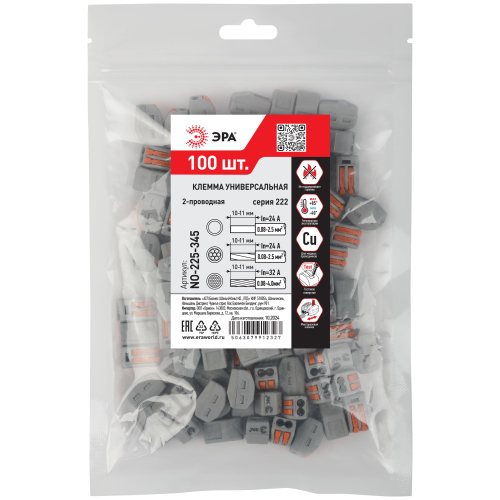 Универсальные клеммы 222 серии с рычагами ЭРА предназначены для многократного соединения всех типов проводников (медных одножильных и многожильных, оконцованных втулочными наконечниками НШвИ) без использования специального инструмента. При подсоединении проводников с изолированными наконечниками НШвИ их макс. сечение должно быть на один размер меньше максимального сечения клеммы.