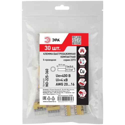 Быстрозажимные компактные клеммы 2273 серии ЭРА предназначены для однократного подключения медных одножильных проводников без использования специального инструмента. Применяются для быстрого и удобного соединения и разводки проводников в распределительных коробках, а также для подключения осветительного и другого электрооборудования в условиях ограниченного пространства.