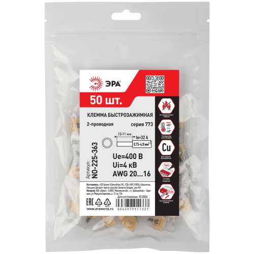 Быстрозажимные клеммы 773 серии ЭРА предназначены для однократного подключения медных одножильных проводников без использования специального инструмента. Применяются для быстрого и удобного соединения и разводки проводников в распределительных коробках, а также для подключения электрооборудования, имеющего повышенного до 7 кВт (32А, 220В) энергопотребление.