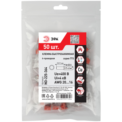 Быстрозажимные клеммы 773 серии ЭРА предназначены для однократного подключения медных одножильных проводников без использования специального инструмента. Применяются для быстрого и удобного соединения и разводки проводников в распределительных коробках, а также для подключения электрооборудования, имеющего повышенного до 7 кВт (32А, 220В) энергопотребление.