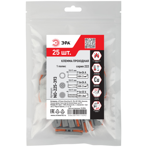 Универсальные проходные клеммы 222 серии с рычагами ЭРА предназначены для создания многократных соединений всех типов проводников (медных одножильных и многожильных, оконцованных втулочными наконечниками НШвИ) без использования специального инструмента. При подсоединении проводников с изолированными наконечниками НШвИ их максимальное сечение должно быть на один размер меньше максимального сечения клеммы.