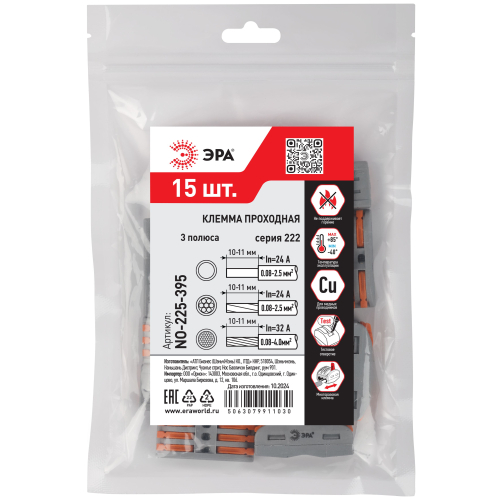 Универсальные проходные клеммы 222 серии с рычагами ЭРА предназначены для создания многократных соединений всех типов проводников (медных одножильных и многожильных, оконцованных втулочными наконечниками НШвИ) без использования специального инструмента. При подсоединении проводников с изолированными наконечниками НШвИ их максимальное сечение должно быть на один размер меньше максимального сечения клеммы.