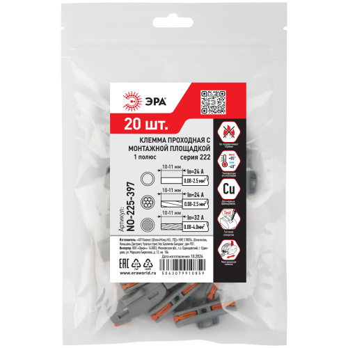Универсальные проходные клеммы с монтажной площадкой 222 серии с рычагами ЭРА предназначены для создания многократных соединений всех типов проводников (медных одножильных и многожильных, оконцованных втулочными наконечниками НШвИ) без использования специального инструмента. При подсоединении проводников с изолированными наконечниками НШвИ их макс. сечение должно быть на один размер меньше максимального сечения клеммы.