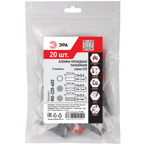 Универсальные проходные разъёмные клеммы 222 серии с рычагами ЭРА предназначены для создания многократных разъёмных соединений всех типов проводников (медных одножильных и многожильных, оконцованных втулочными наконечниками НШвИ) без использования специального инструмента.