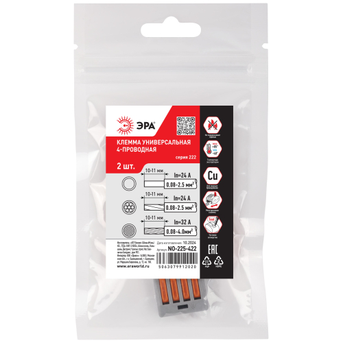 Универсальные клеммы 222 серии с рычагами ЭРА предназначены для многократного соединения всех типов проводников (медных одножильных и многожильных, оконцованных втулочными наконечниками НШвИ) без использования специального инструмента. При подсоединении проводников с изолированными наконечниками НШвИ их макс. сечение должно быть на один размер меньше максимального сечения клеммы.