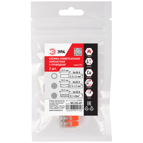 Универсальные компактные клеммы 221 серии с рычагами ЭРА предназначены для многократного соединения всех типов проводников (медных одножильных и многожильных, оконцованных втулочными наконечниками НШвИ) без использования специального инструмента. При подсоединении проводников с изолированными наконечниками НШвИ их макс. сечение должно быть на один размер меньше максимального сечения клеммы.