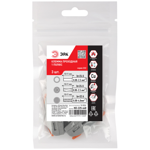 Универсальные проходные клеммы 222 серии с рычагами ЭРА предназначены для создания многократных соединений всех типов проводников (медных одножильных и многожильных, оконцованных втулочными наконечниками НШвИ) без использования специального инструмента. При подсоединении проводников с изолированными наконечниками НШвИ их максимальное сечение должно быть на один размер меньше максимального сечения клеммы.