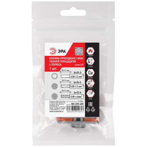 Универсальные проходные клеммы с монтажной площадкой 222 серии с рычагами ЭРА предназначены для создания многократных соединений всех типов проводников (медных одножильных и многожильных, оконцованных втулочными наконечниками НШвИ) без использования специального инструмента. При подсоединении проводников с изолированными наконечниками НШвИ их макс. сечение должно быть на один размер меньше максимального сечения клеммы.