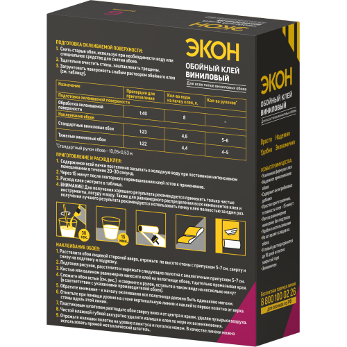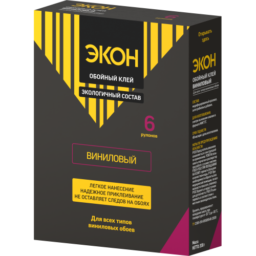 Предназначен для наклеивания всех видов виниловых обоев, вспененного винила, шелкографии. Высококачественный, быстрорастворимый клей на основе метилцеллюлозы, модифицированного крахмала. Не оставляет следов на обоях. Содержит бактерицидные и противогрибковые добавки, предотвращающие первичное образование грибка.
