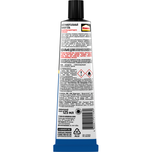 Универсальный контактный клей в виде геля, не растекается на вертикальных поверхностях и подходит для пористых поверхностей. Предназначен для склеивания в различных сочетаниях, таких материалов, как дерево, металл, резину, бумагу, картон, кожу, ткань, пробку, поролон, фарфор, керамику, стекло. Идеален для вертикальных впитывающих и пористых поверхностей, не оставляет заметных следов. Не содержит толуол - безопасен при использовании и эксплуатации. Не подходит для склеивания посуды, контактирующей с пищей, стиропора, полиэтилена и полипропилена.