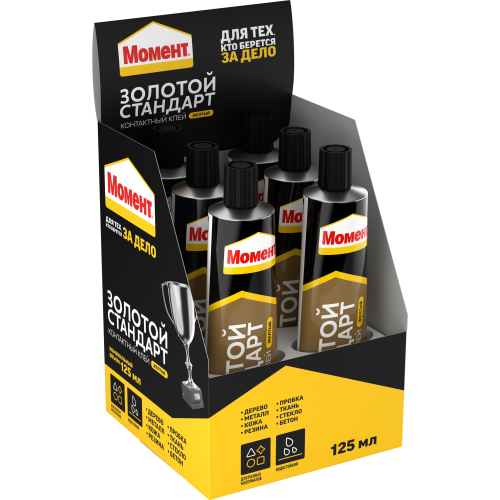 Универсальный контактный клей Момент Золотой Стандарт позволяет работать с широким спектром материалов.