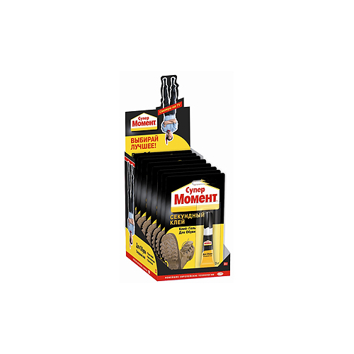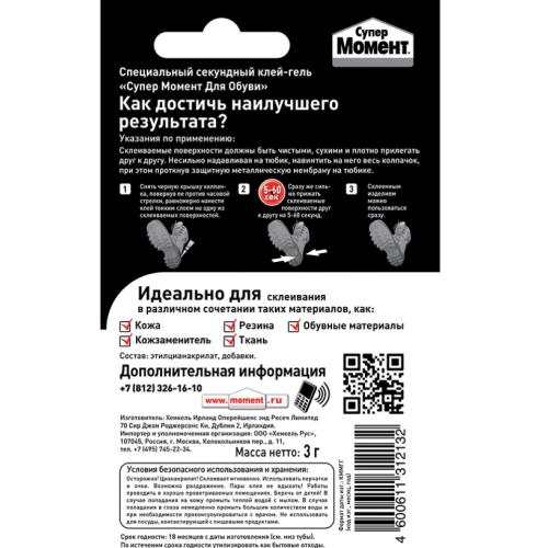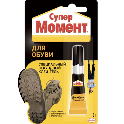 Обувной супер клей Момент 154578 - однокомпонентный гелеобразный клей. В его состав входят цианакритал и загустители. Клей специально разработан для ремонта обуви. Мгновенно склеивает и заполняет мельчайшие трещины, образуя незаметный клеевой шов. Такой клей подходит для склеивания таких материалов, как кожа, кожзаменитель, резина, ткань, картон, бумага, дерево, металл, керамика и пластмасса. Клей идеально подходит для ремонта обуви. Шов получается прозрачным и не пропускает влагу. Клей необходимо хранить в сухом месте при температуре от -20 ºС до +30 ºС. Срок годности - 24 месяца.