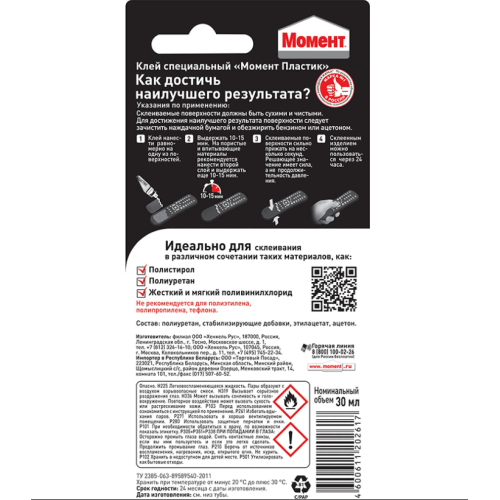 Специальный контактный клей для надежного соединения изделий из пластиков. Специальный контактный клей для надежного соединения пластиковых деталей. Специальный для различных видов пластика. Прозрачный. Водостойкий. Используют для склеивания мягкого и жесткого поливинилхлорида, полистирола, оргстекла и других видов пластика. Клеевой шов получается очень прочный, водостойкий, морозостойкий, а также устойчивый к воздействию разбавленных кислот и щелочей. Нельзя применять для тефлона, полиэтилена и полипропилена. Необходимо хранить при температуре о -20ºС до +30ºС. Если клей замерз, то свои свойства он восстановит при комнатной температуре. Поставляется на блистере.
