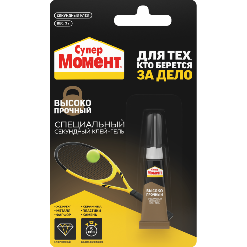 Супер Момент Высокопрочный является универсальным секундным клеем в форме геля, отлично подходит для соединения различных материалов. Водостойкий и термостойкий, обладает повышенной прочнойстю клеевого шва. Быстрый, прозрачный, не растекается.