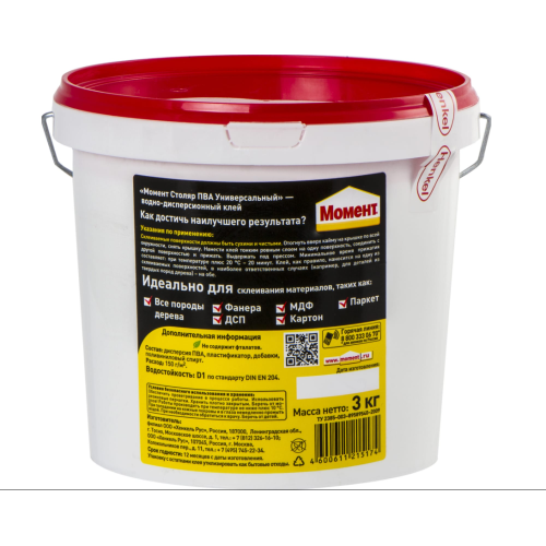 Универсальный клей на основе водной дисперсии ПВА для всех пород дерева. Универсальный клей на основе водной дисперсии ПВА, подходящий для всех пород дерева. Высокая прочность склеивания. Не окрашивает дерево. Термостойкий. Прозрачный шов после высыхания. Для склеивания, ремонта и изготовления изделий из различных видов дерева, ДСП, фанеры, картона и т.п. Обладает хорошей вязкостью, что позволяет его применять для различных работ. Начальная сила схватывания до 30кг/см2. Нанесите клей на одну из поверхностей тонким ровным слоем. Соедините поверхности и прижмите их друг к другу на 15-20 минут. При склеивании температура окружающей среды не должна быть ниже, чем +6С. Склеенные детали можно обрабатывать через 24 часа. Удаление остатков клея с инструментов и материалов производится с помощью воды. Засохший клей удаляется механическим способом.