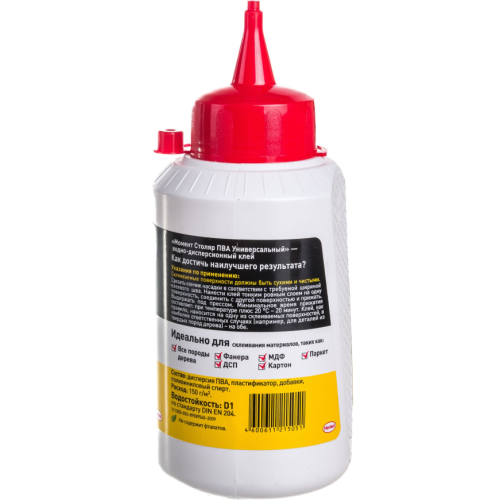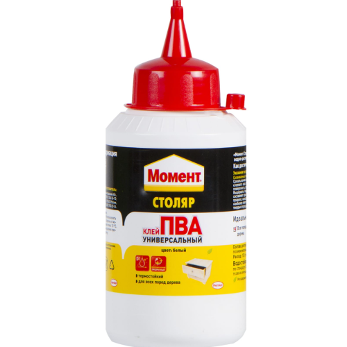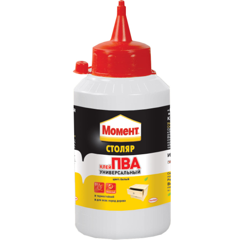 Универсальный клей на основе водной дисперсии ПВА для всех пород дерева. Универсальный клей на основе водной дисперсии ПВА, подходящий для всех пород дерева. Высокая прочность склеивания. Не окрашивает дерево. Термостойкий. Прозрачный шов после высыхания. Для склеивания, ремонта и изготовления изделий из различных видов дерева, ДСП, фанеры, картона и т.п. Обладает хорошей вязкостью, что позволяет его применять для различных работ. Начальная сила схватывания до 30кг/см2. Нанесите клей на одну из поверхностей тонким ровным слоем. Соедините поверхности и прижмите их друг к другу на 15-20 минут. При склеивании температура окружающей среды не должна быть ниже, чем +6С. Склеенные детали можно обрабатывать через 24 часа. Удаление остатков клея с инструментов и материалов производится с помощью воды. Засохший клей удаляется механическим способом.