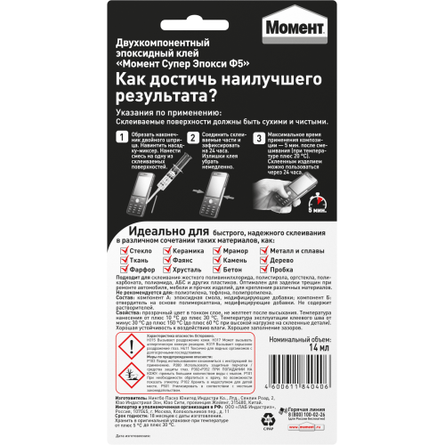 Универсальный эпоксидный клей Момент Супер Эпокси Формула 5 в шприце обеспечит вас комфортным, прочным и быстрым склеиванием при работе практически с любыми материалами.