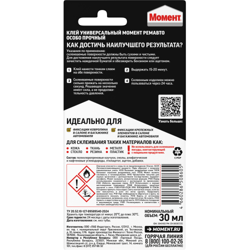 Идеален для склеивания ковролина с корпусом автомобиля, фиксации крепжных лент внутри багажника. Подходит для следующих материалов: Резина Кожа Металл Пластик Ткань Стекло. Не пригоден для склеивания пенополистирола (пенопласта), полиэтилена, полипропилена. Не применяйте клей для склеивания материалов, которые будут непосредственно контактировать с пищей.