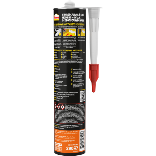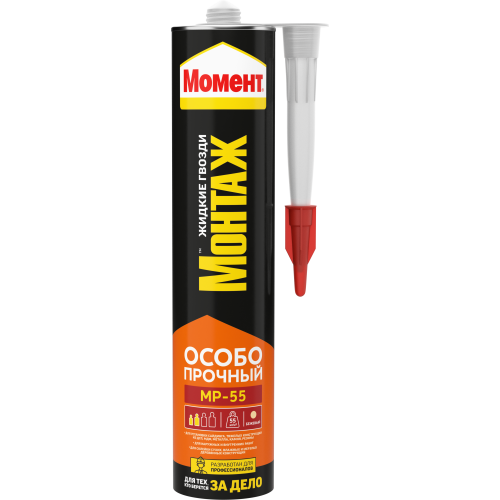 Монтажный клей Момент Монтаж Особопрочный МР-55 специально создан для применения во всех областях домашнего строительства и ремонта. Используется с большинством известных материалов. Высокая первоначальная сила склеивания - 55 кг/м2. Легкий в использовании и эксплуатации! Быстрое схватывание. Водостойкий. Обеспечивает хорошую адгезию с широким диапазоном строительных материалов. Компенсирует незначительные неровности поверхности при склеивании. Снижает звукопроницаемость. В неотверждённом состоянии легко удаляется. Не подходит для полиэтилена, полипропилена, тефлона, материалов, разрушаемых растворителем, входящим в состав клея.